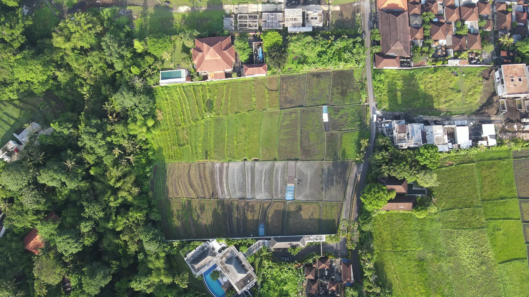The land features a rectangular shape with a gentle 3–5° slope, making it ideal for development while maintaining natural character. The fertile volcanic soil supports lush tropical vegetation, including mature coconut trees. A mix of flat and contoured sections allows for diverse building concepts, while the surrounding rice fields and riverside views enhance privacy and exclusivity.